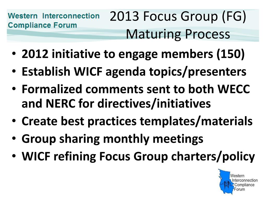 2013 Focus Group (FG) Maturing Process 2012 initiative to engage members (150) Establish WICF agenda topics/presenters Formalized comments sent to both WECC and NERC for directives/initiatives Create best practices templates/materials Group sharing monthly meetings WICF refining Focus Group charters/policy