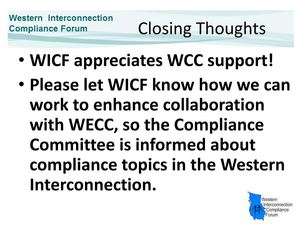 Closing Thoughts WICF appreciates WCC support! Please let WICF know how we can work to enhance collaboration with WECC, so the Compliance Committee is informed about compliance topics in the Western Interconnection.