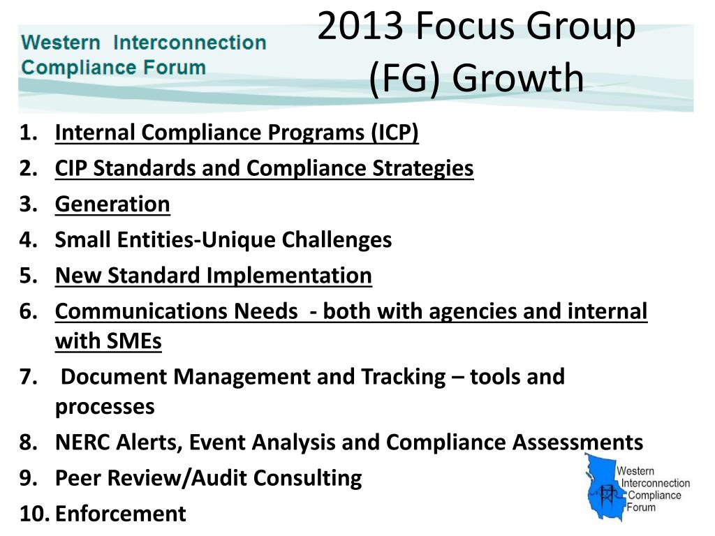 2013 Focus Group (FG) Growth Internal Compliance Programs (ICP) CIP Standards and Compliance Strategies Generation Small Entities-Unique Challenges New Standard Implementation Communications Needs - both with agencies and internal with SMEs Document Management and Tracking – tools and processes NERC Alerts, Event Analysis and Compliance Assessments Peer Review/Audit Consulting Enforcement
