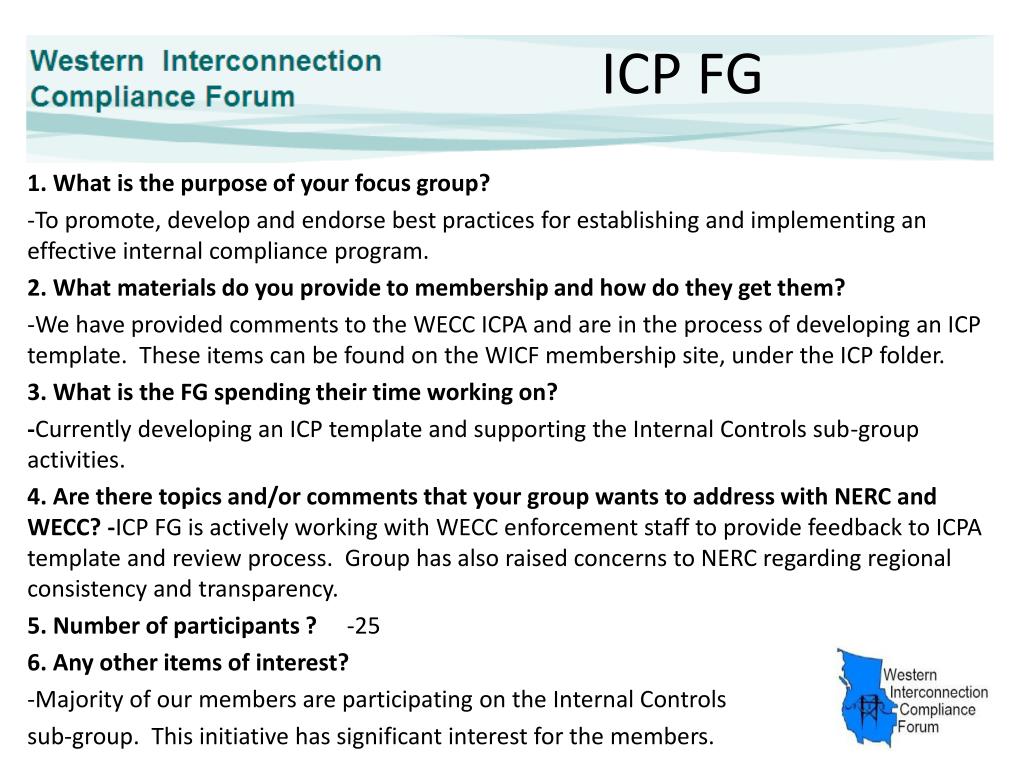 ICP FG 1. What is the purpose of your focus group? -To promote, develop and endorse best practices for establishing and implementing an effective internal compliance program. 2. What materials do you provide to membership and how do they get them? -We have provided comments to the WECC ICPA and are in the process of developing an ICP template. These items can be found on the WICF membership site, under the ICP folder. 3. What is the FG spending their time working on? -Currently developing an ICP template and supporting the Internal Controls sub-group activities. 4. Are there topics and/or comments that your group wants to address with NERC and WECC? -ICP FG is actively working with WECC enforcement staff to provide feedback to ICPA template and review process. Group has also raised concerns to NERC regarding regional consistency and transparency. 5. Number of participants ? -25 6. Any other items of interest? -Majority of our members are participating on the Internal Controls sub-group. This initiative has significant interest for the members.