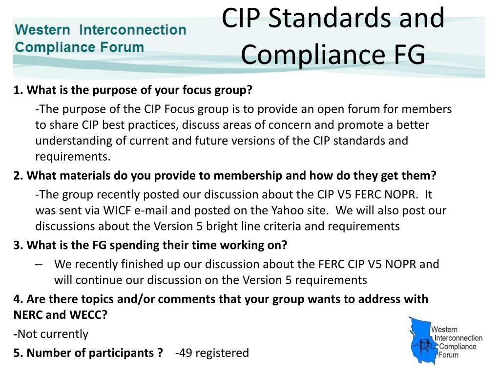 CIP Standards and Compliance FG 1. What is the purpose of your focus group? -The purpose of the CIP Focus group is to provide an open forum for members to share CIP best practices, discuss areas of concern and promote a better understanding of current and future versions of the CIP standards and requirements. 2. What materials do you provide to membership and how do they get them? -The group recently posted our discussion about the CIP V5 FERC NOPR. It was sent via WICF e-mail and posted on the Yahoo site. We will also post our discussions about the Version 5 bright line criteria and requirements 3. What is the FG spending their time working on? • We recently finished up our discussion about the FERC CIP V5 NOPR and will continue our discussion on the Version 5 requirements 4. Are there topics and/or comments that your group wants to address with NERC and WECC? -Not currently 5. Number of participants ? -49 registered