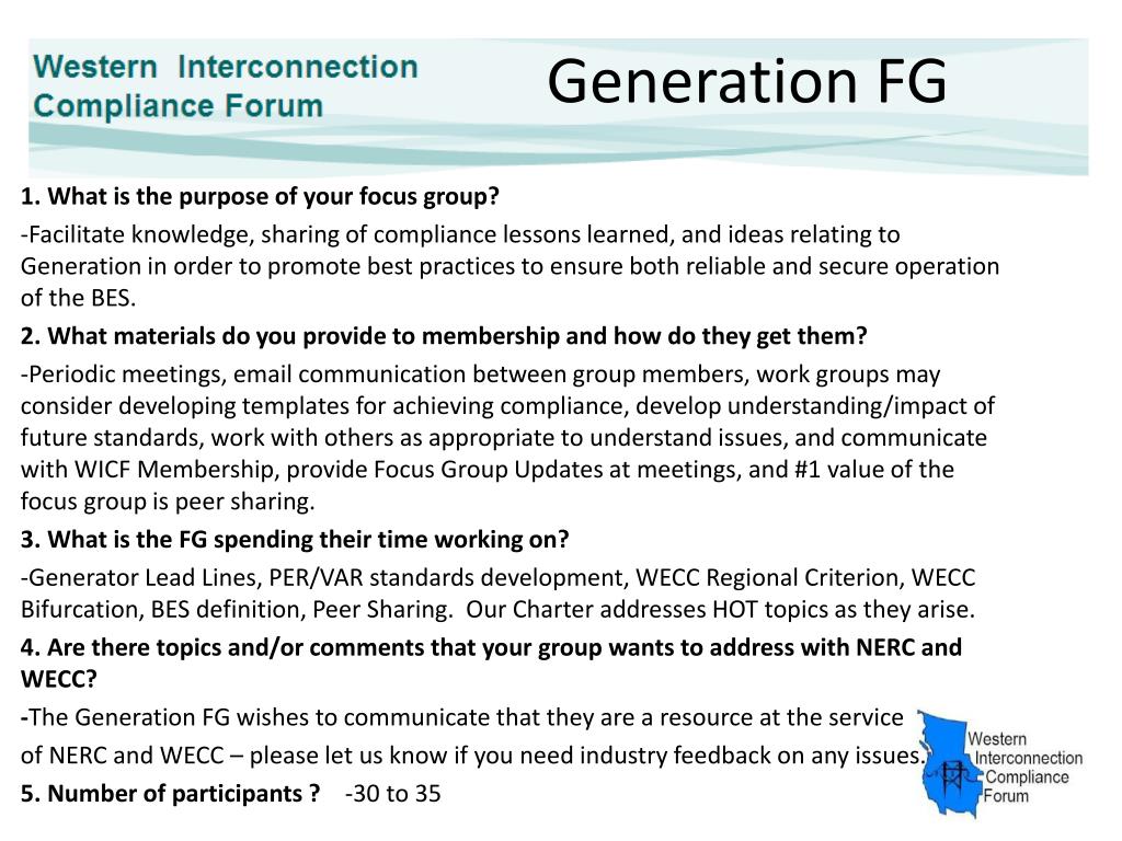 Generation FG 1. What is the purpose of your focus group? -Facilitate knowledge, sharing of compliance lessons learned, and ideas relating to Generation in order to promote best practices to ensure both reliable and secure operation of the BES. 2. What materials do you provide to membership and how do they get them? -Periodic meetings, email communication between group members, work groups may consider developing templates for achieving compliance, develop understanding/impact of future standards, work with others as appropriate to understand issues, and communicate with WICF Membership, provide Focus Group Updates at meetings, and #1 value of the focus group is peer sharing. 3. What is the FG spending their time working on? -Generator Lead Lines, PER/VAR standards development, WECC Regional Criterion, WECC Bifurcation, BES definition, Peer Sharing. Our Charter addresses HOT topics as they arise. 4. Are there topics and/or comments that your group wants to address with NERC and WECC? -The Generation FG wishes to communicate that they are a resource at the service of NERC and WECC – please let us know if you need industry feedback on any issues. 5. Number of participants ? -30 to 35