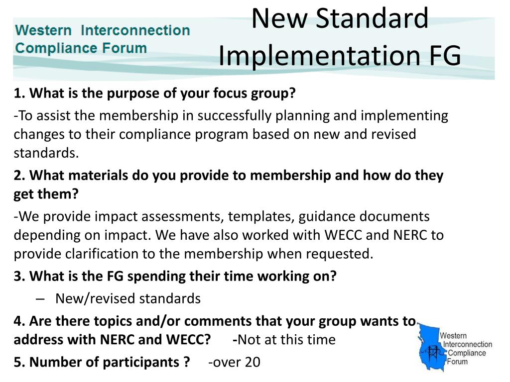 New Standard Implementation FG 1. What is the purpose of your focus group? -To assist the membership in successfully planning and implementing changes to their compliance program based on new and revised standards. 2. What materials do you provide to membership and how do they get them? -We provide impact assessments, templates, guidance documents depending on impact. We have also worked with WECC and NERC to provide clarification to the membership when requested. 3. What is the FG spending their time working on? • New/revised standards 4. Are there topics and/or comments that your group wants to address with NERC and WECC? -Not at this time 5. Number of participants ? -over 20