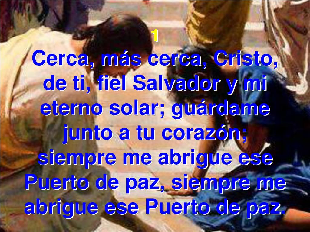 1 Cerca, más cerca, Cristo, de ti, fiel Salvador y mi eterno solar; guárdame junto a tu corazón; siempre me abrigue ese Puerto de paz, siempre me abrigue ese Puerto de paz.