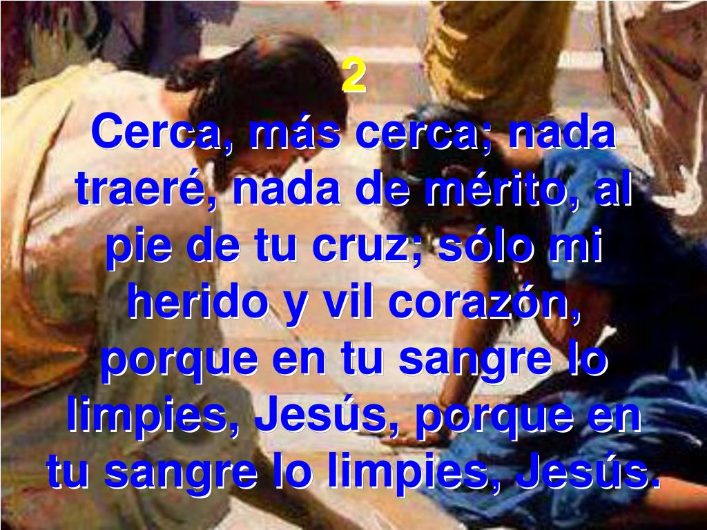 2 Cerca, más cerca; nada traeré, nada de mérito, al pie de tu cruz; sólo mi herido y vil corazón, porque en tu sangre lo limpies, Jesús, porque en tu sangre lo limpies, Jesús.