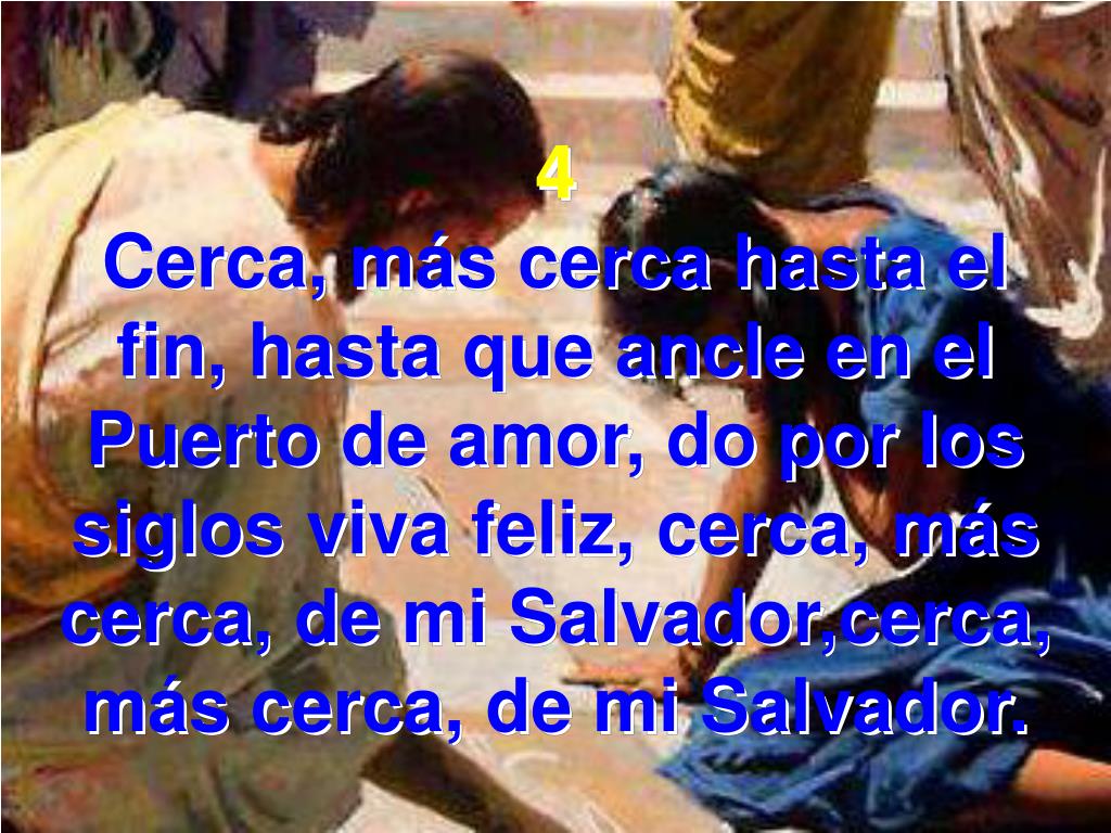4 Cerca, más cerca hasta el fin, hasta que ancle en el Puerto de amor, do por los siglos viva feliz, cerca, más cerca, de mi Salvador,cerca, más cerca, de mi Salvador.
