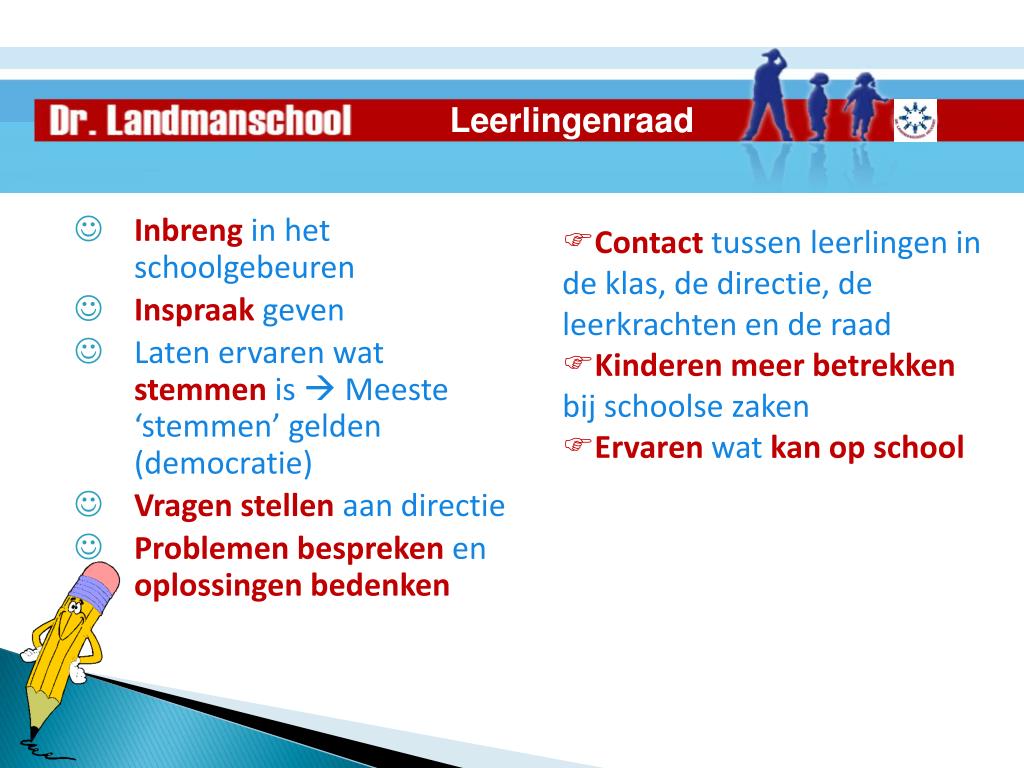 Leerlingenraad • Inbreng in het schoolgebeuren • Inspraak geven • Laten ervaren wat stemmen is Meeste ‘stemmen’ gelden (democratie) • Vragenstellen aan directie • Problemenbespreken en oplossingenbedenken • Contact tussen leerlingen in de klas, de directie, de leerkrachten en de raad • Kinderenmeerbetrekken bij schoolse zaken • Ervaren wat kanopschool