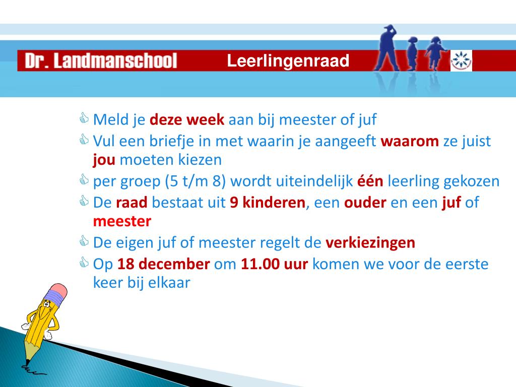 Leerlingenraad • Meld je deze week aan bij meester of juf • Vul een briefje in met waarin je aangeeft waarom ze juist jou moeten kiezen • per groep (5 t/m 8) wordt uiteindelijk één leerling gekozen • De raad bestaat uit 9kinderen, een ouder en een juf of meester • De eigen juf of meester regelt de verkiezingen • Op 18 december om 11.00 uur komen we voor de eerste keer bij elkaar