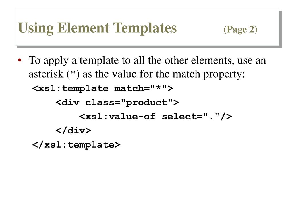 Using Element Templates (Page 2) • To apply a template to all the other elements, use an asterisk (*) as the value for the match property: <xsl:template match="*"> <div class="product"> <xsl:value-of select="."/> </div> </xsl:template>