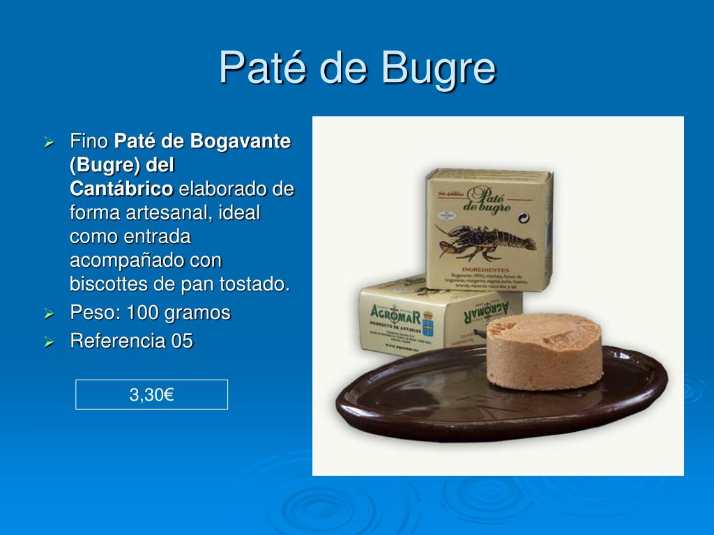 Paté de Bugre • Fino Paté de Bogavante (Bugre) del Cantábrico elaborado de forma artesanal, ideal como entrada acompañado con biscottes de pan tostado. • Peso: 100 gramos • Referencia 05 3,30€