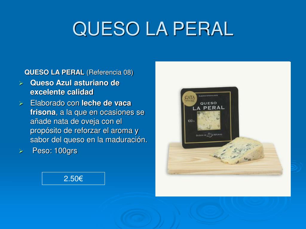 QUESO LA PERAL QUESO LA PERAL (Referencia 08) • Queso Azul asturiano de excelente calidad • Elaborado con leche de vaca frisona, a la que en ocasiones se añade nata de oveja con el propósito de reforzar el aroma y sabor del queso en la maduración. • Peso: 100grs 2.50€