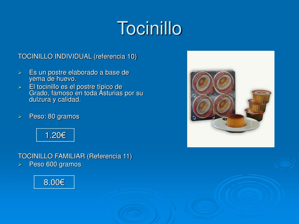 Tocinillo TOCINILLO INDIVIDUAL (referencia 10) • Es un postre elaborado a base de yema de huevo. • El tocinillo es el postre típico de Grado, famoso en toda Asturias por su dulzura y calidad. • Peso: 80 gramos TOCINILLO FAMILIAR (Referencia 11) • Peso 600 gramos