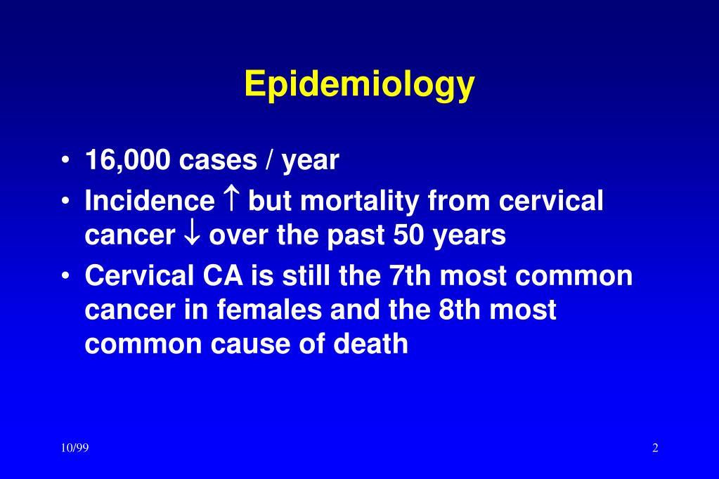 Epidemiology • 16,000 cases / year • Incidence but mortality from cervical cancer over the past 50 years • Cervical CA is still the 7th most common cancer in females and the 8th most common cause of death