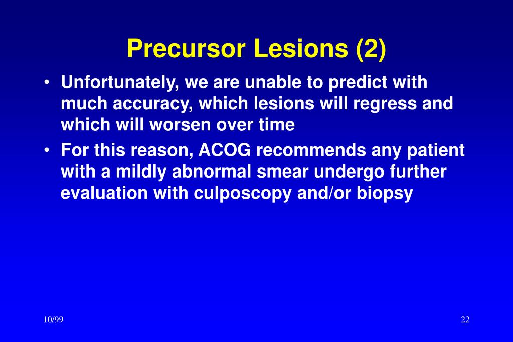 Precursor Lesions (2) • Unfortunately, we are unable to predict with much accuracy, which lesions will regress and which will worsen over time • For this reason, ACOG recommends any patient with a mildly abnormal smear undergo further evaluation with culposcopy and/or biopsy