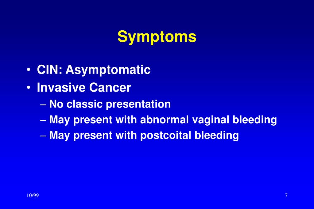 Symptoms • CIN: Asymptomatic • Invasive Cancer • No classic presentation • May present with abnormal vaginal bleeding • May present with postcoital bleeding