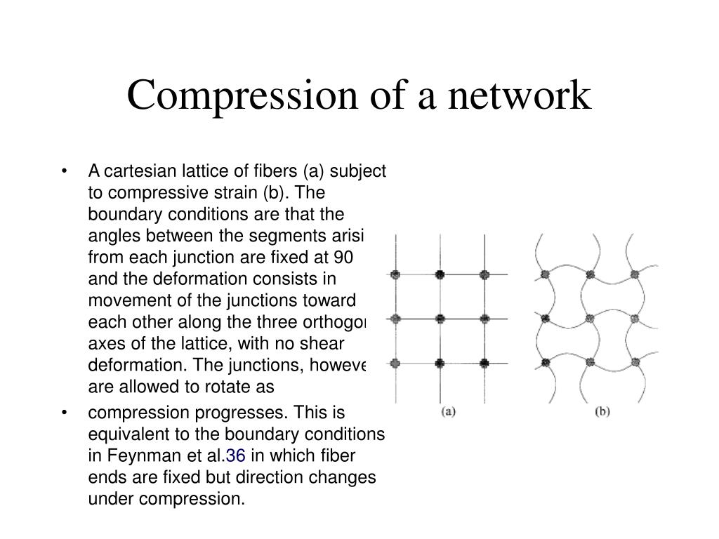 Compression of a network • A cartesian lattice of fibers (a) subject to compressive strain (b). The boundary conditions are that the angles between the segments arising from each junction are fixed at 90 and the deformation consists in movement of the junctions toward each other along the three orthogonal axes of the lattice, with no shear deformation. The junctions, however, are allowed to rotate as • compression progresses. This is equivalent to the boundary conditions in Feynman et al.36 in which fiber ends are fixed but direction changes under compression.