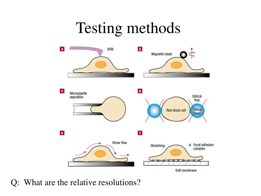 Cell Deformation and Stiffness • Most cells are constantly deformed in vivo by both internal and external forces. • Experimental deformations can be done by poking, squishing, osmotic swelling, electrical/magnetic fields, drugs, etc. • Cells have both area and shear stiffness, mostly due to the cytoskeleton, although lipids contribute some.