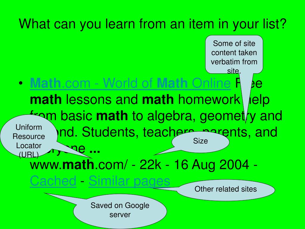 What can you learn from an item in your list? Some of site content taken verbatim from site. • Math.com - World of Math Online Free math lessons and math homework help from basic math to algebra, geometry and beyond. Students, teachers, parents, and everyone ...www.math.com/ - 22k - 16 Aug 2004 - Cached - Similar pages Uniform Resource Locator (URL) Size Other related sites Saved on Google server