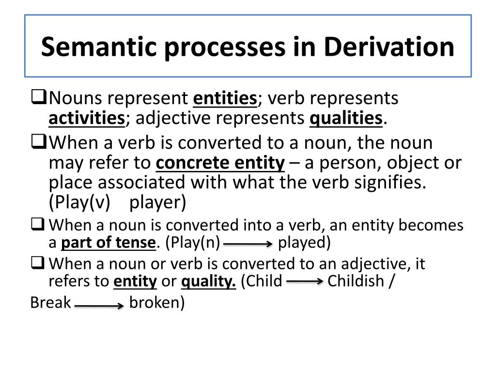 Semantic processes in Derivation • Nouns represent entities; verb represents activities; adjective represents qualities. • When a verb is converted to a noun, the noun may refer to concrete entity – a person, object or place associated with what the verb signifies. (Play(v) player) • When a noun is converted into a verb, an entity becomes a part of tense. (Play(n) played) • When a noun or verb is converted to an adjective, it refers to entity or quality. (Child Childish / Break broken)