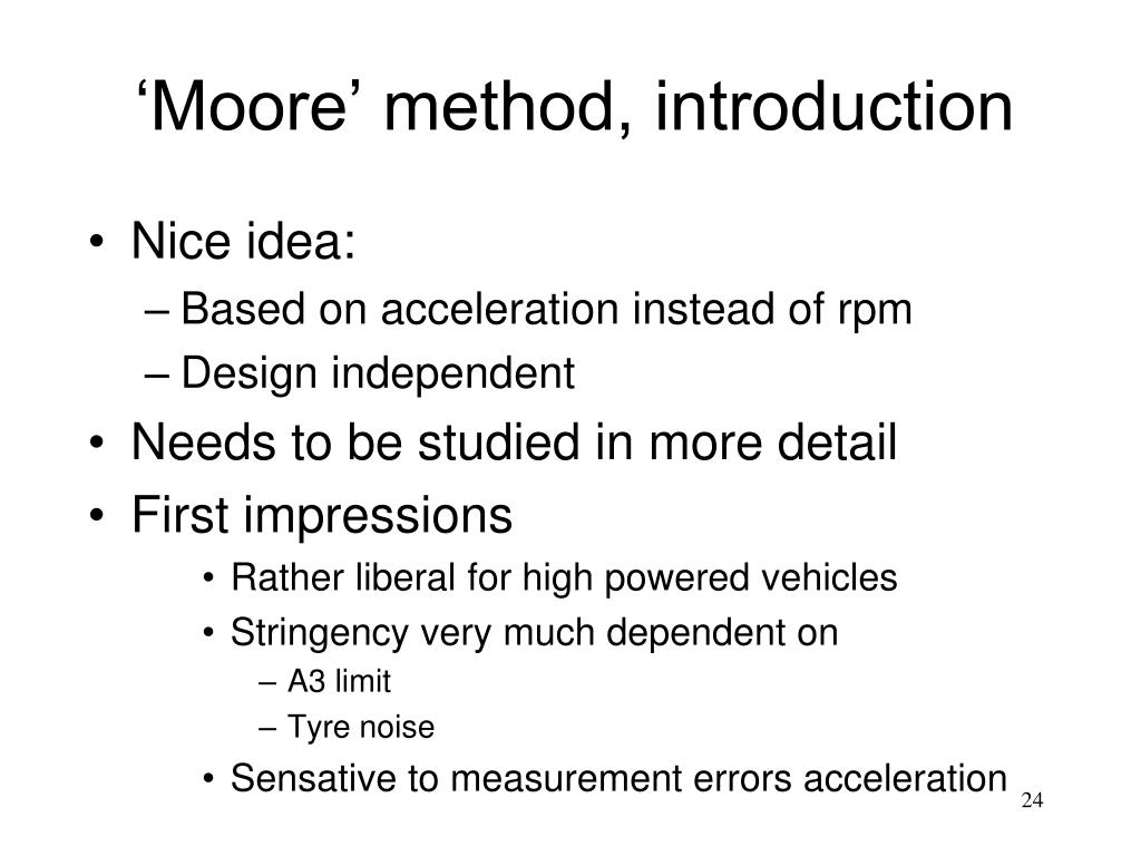 ‘Moore’ method, introduction • Nice idea: • Based on acceleration instead of rpm • Design independent • Needs to be studied in more detail • First impressions • Rather liberal for high powered vehicles • Stringency very much dependent on • A3 limit • Tyre noise • Sensative to measurement errors acceleration