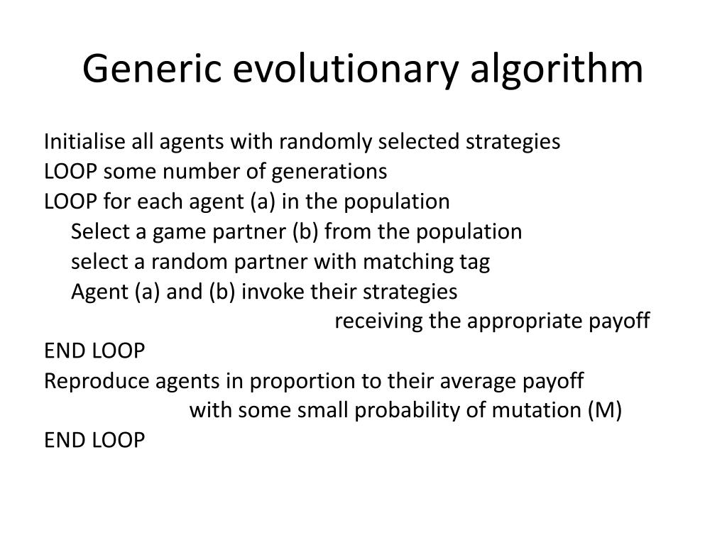 Generic evolutionary algorithm Initialise all agents with randomly selected strategies LOOP some number of generations LOOP for each agent (a) in the population Select a game partner (b) from the population select a random partner with matching tag Agent (a) and (b) invoke their strategies receiving the appropriate payoff END LOOP Reproduce agents in proportion to their average payoff with some small probability of mutation (M) END LOOP