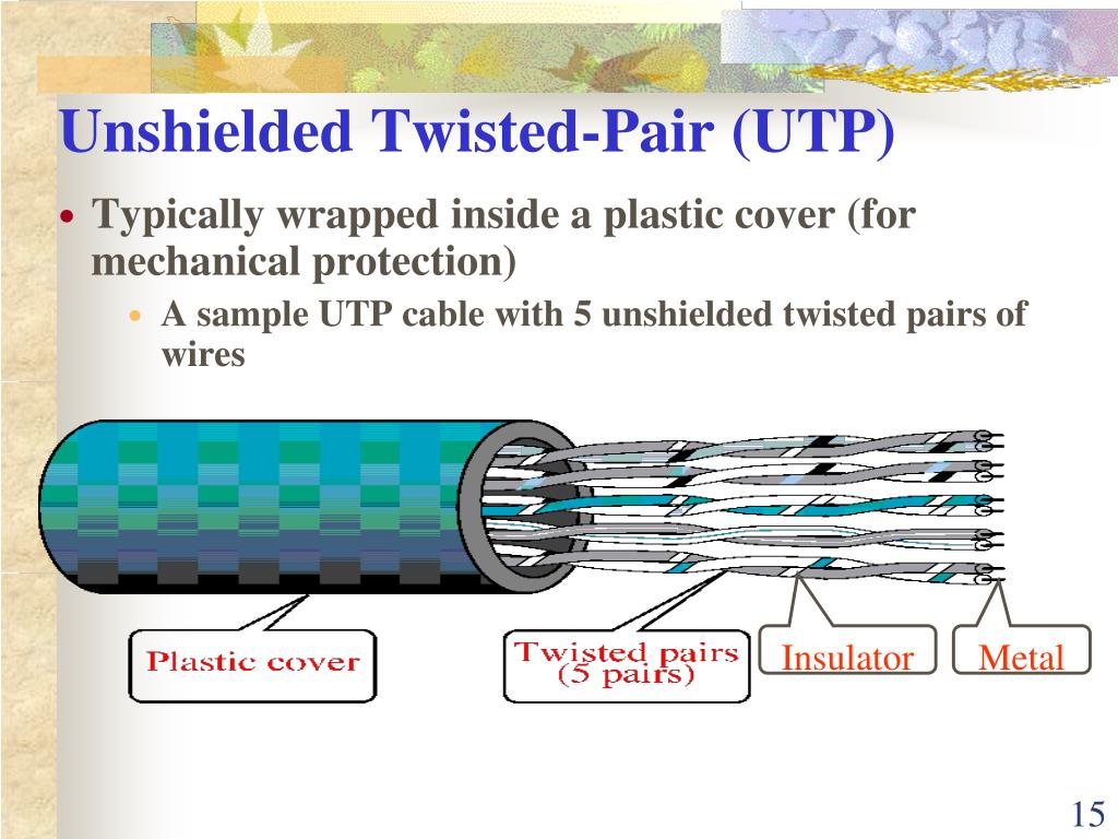 Insulator Metal Unshielded Twisted-Pair (UTP) • Typically wrapped inside a plastic cover (for mechanical protection) • A sample UTP cable with 5 unshielded twisted pairs of wires
