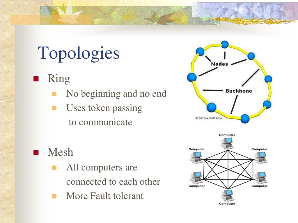 Topologies • Ring • No beginning and no end • Uses token passing to communicate • Mesh • All computers are connected to each other • More Fault tolerant