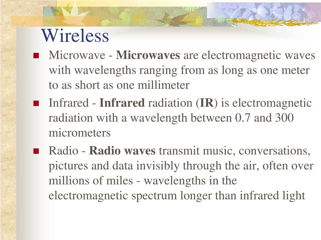 Wireless • Microwave - Microwaves are electromagnetic waves with wavelengths ranging from as long as one meter to as short as one millimeter • Infrared - Infrared radiation (IR) is electromagnetic radiation with a wavelength between 0.7 and 300 micrometers • Radio - Radio waves transmit music, conversations, pictures and data invisibly through the air, often over millions of miles - wavelengths in the electromagnetic spectrum longer than infrared light