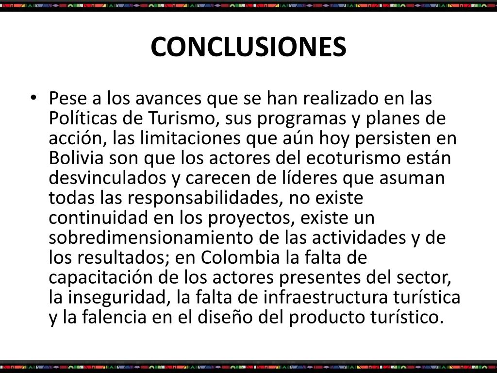 CONCLUSIONES • Pese a los avances que se han realizado en las Políticas de Turismo, sus programas y planes de acción, las limitaciones que aún hoy persisten en Bolivia son que los actores del ecoturismo están desvinculados y carecen de líderes que asuman todas las responsabilidades, no existe continuidad en los proyectos, existe un sobredimensionamiento de las actividades y de los resultados; en Colombia la falta de capacitación de los actores presentes del sector, la inseguridad, la falta de infraestructura turística y la falencia en el diseño del producto turístico.