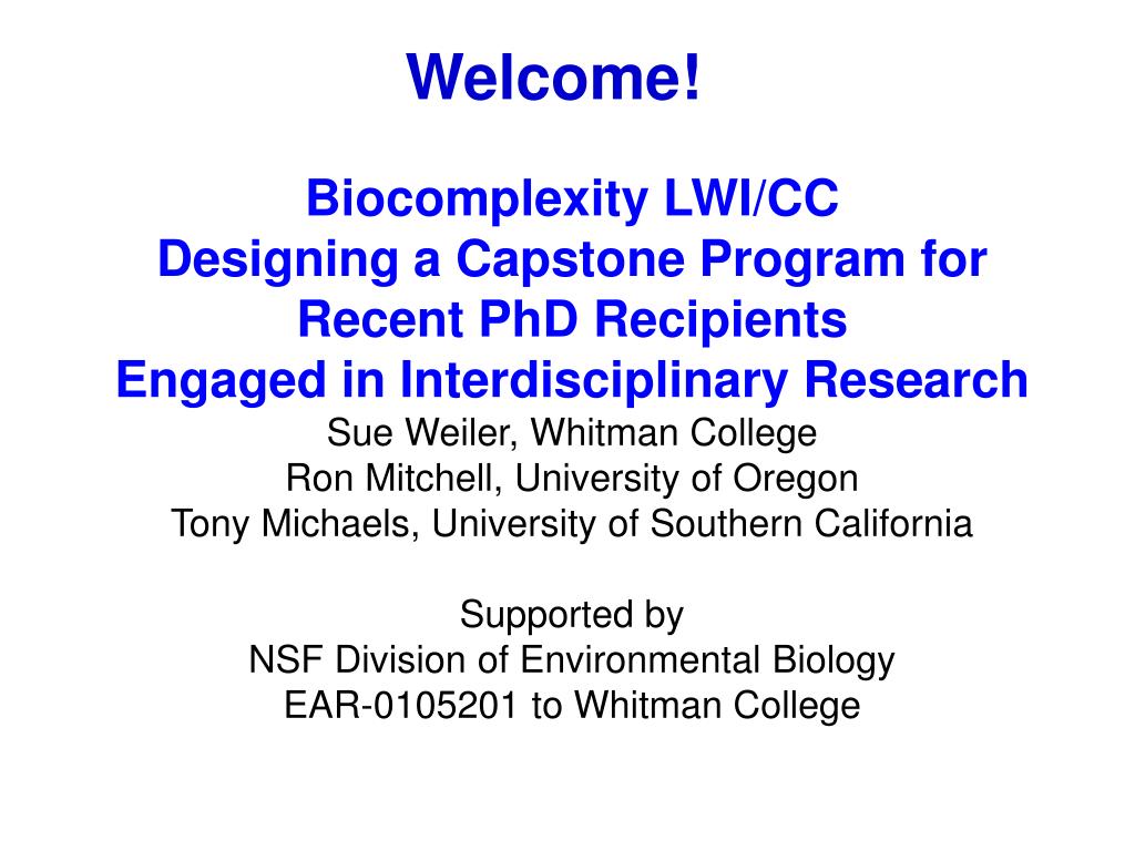Welcome!. Biocomplexity LWI/CC Designing a Capstone Program for Recent PhD Recipients Engaged in Interdisciplinary Research Sue Weiler, Whitman College Ron Mitchell, University of Oregon Tony Michaels, University of Southern California
