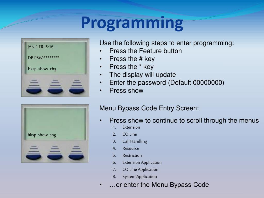 Programming JAN 1 FRI 5:16 DB PSW:******** bksp show chg bksp show chg • Use the following steps to enter programming: • Press the Feature button • Press the # key • Press the * key • The display will update • Enter the password (Default 00000000) • Press show • Menu Bypass Code Entry Screen: • Press show to continue to scroll through the menus • Extension • CO Line • Call Handling • Resource • Restriction • Extension Application • CO Line Application • System Application • …or enter the Menu Bypass Code