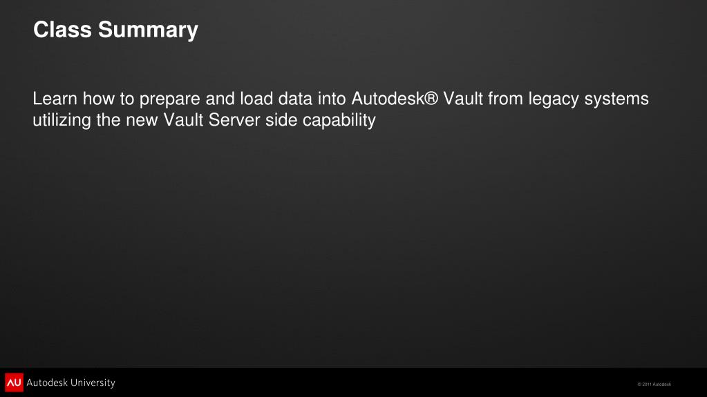Class Summary Learn how to prepare and load data into Autodesk® Vault from legacy systems utilizing the new Vault Server side capability