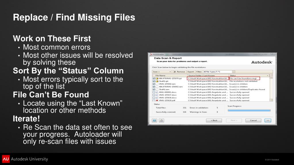 Replace / Find Missing Files Work on These First • Most common errors • Most other issues will be resolved by solving these Sort By the “Status” Column • Most errors typically sort to the top of the list File Can’t Be Found • Locate using the “Last Known” location or other methods Iterate! • Re Scan the data set often to see your progress. Autoloader will only re-scan files with issues