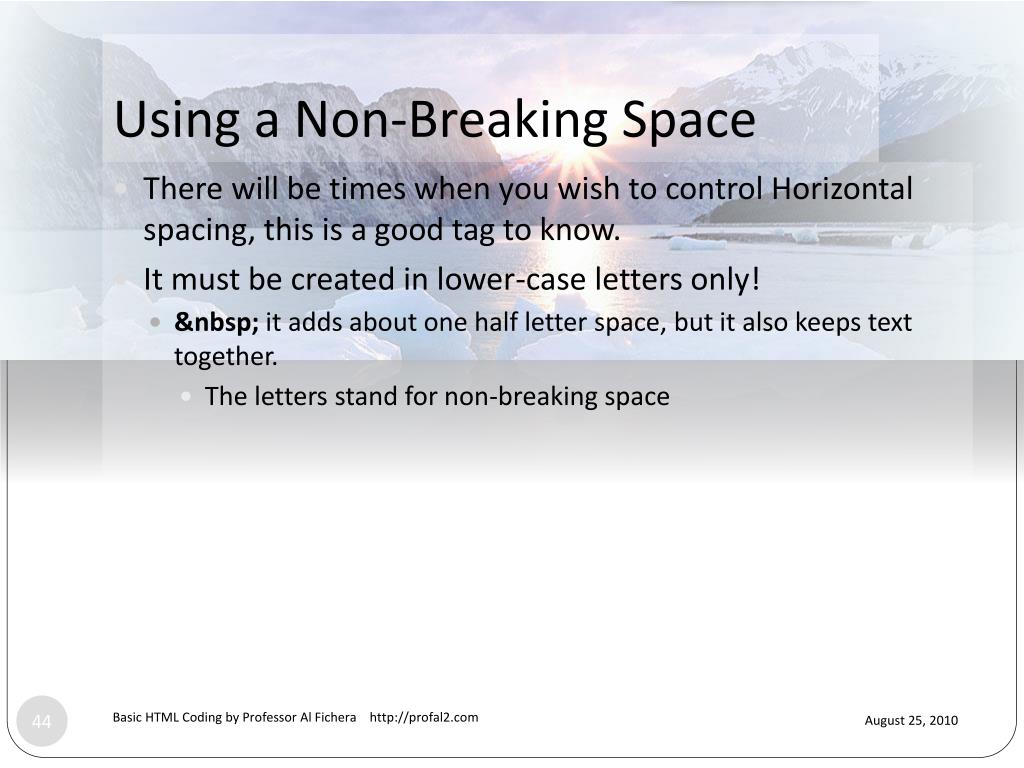Using a Non-Breaking Space • There will be times when you wish to control Horizontal spacing, this is a good tag to know. • It must be created in lower-case letters only! • it adds about one half letter space, but it also keeps text together. • The letters stand for non-breaking space Basic HTML Coding by Professor Al Fichera http://profal2.com