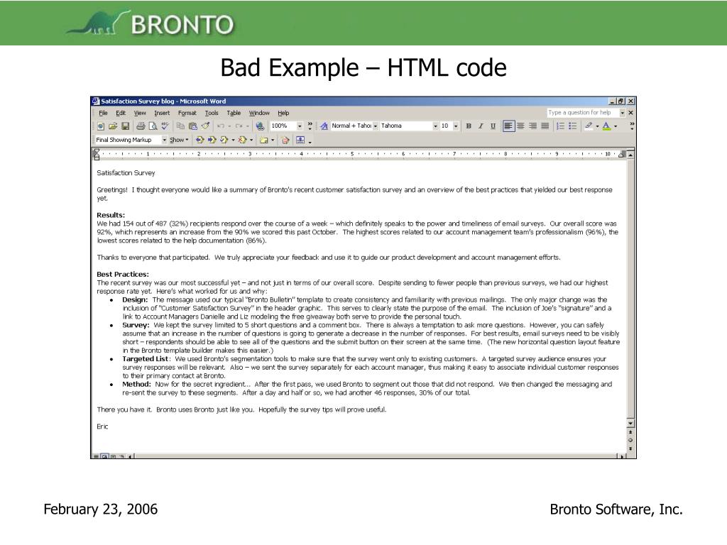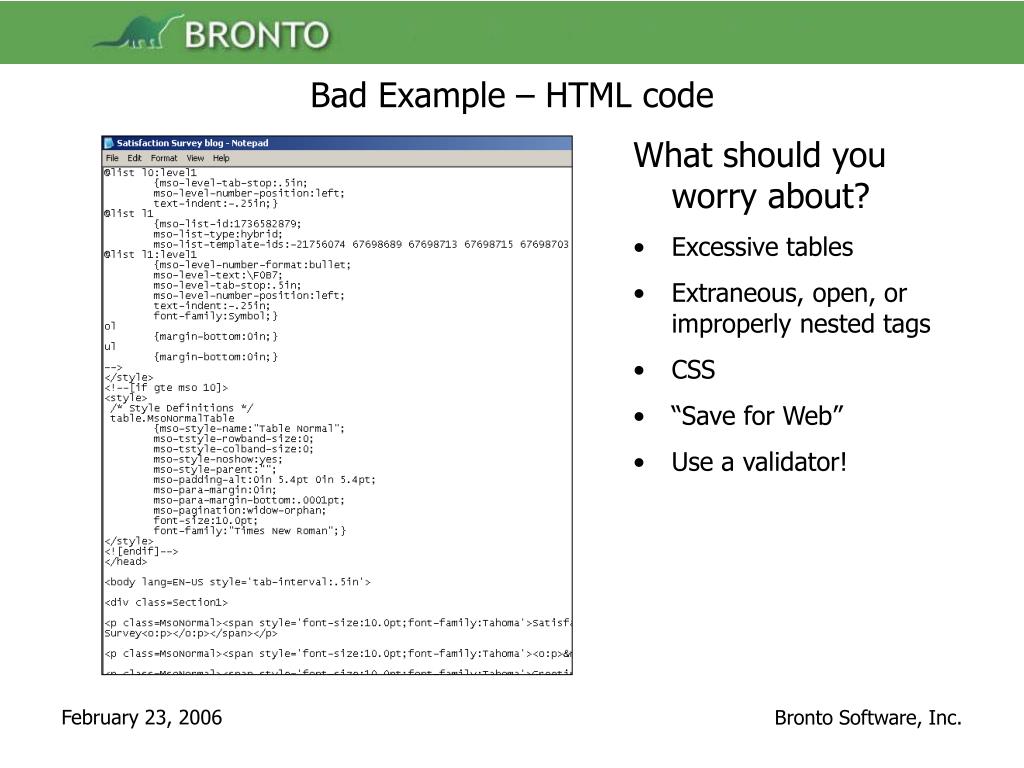 Bad Example – HTML code What should you worry about? • Excessive tables • Extraneous, open, or improperly nested tags • CSS • “Save for Web” • Use a validator! Bronto Software, Inc.