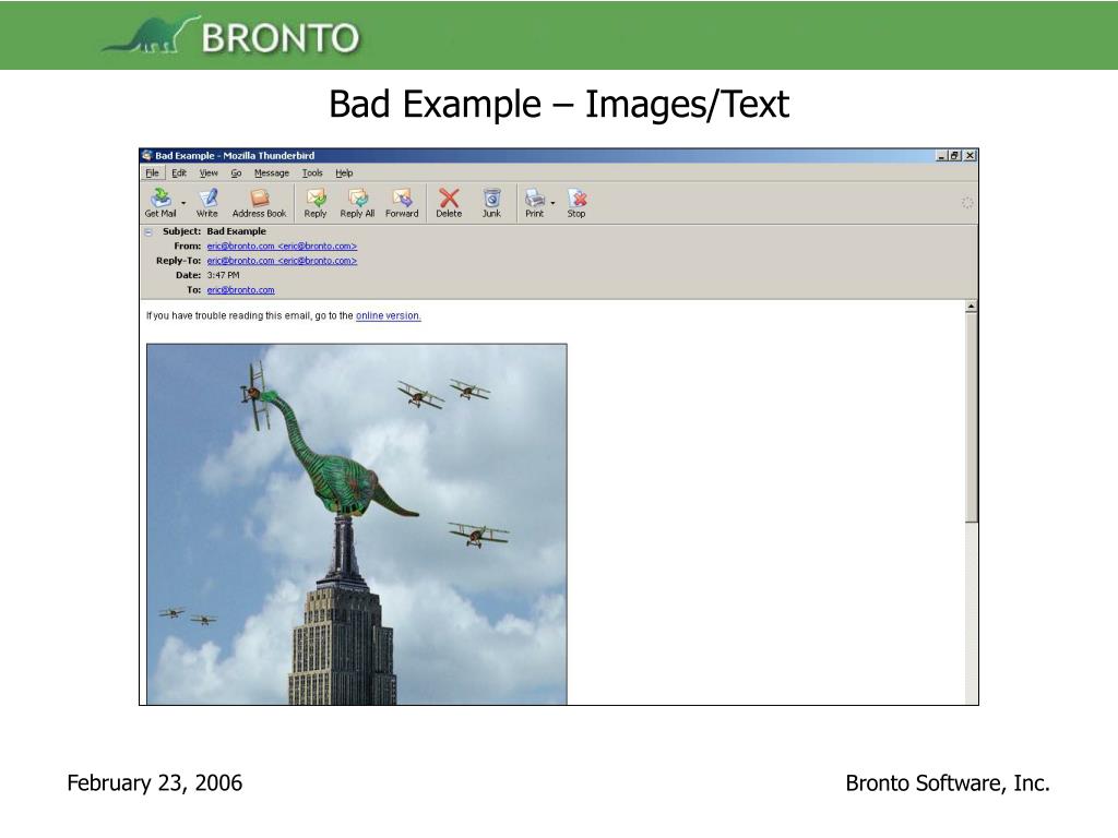 DON’T: Do these things either • Don’t use external style sheets • Use inline styles • Embedded causes problems in webmail programs • Don’t use relative image/document links • Link absolutely • Don’t “Save as HTML” in Word, Publisher, etc. • Avoid: • Area maps • Dark backgrounds Bronto Software, Inc.