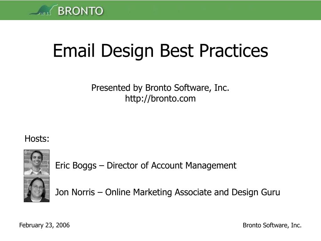 Email Design Best PracticesPresented by Bronto Software, Inc.http://bronto.com Hosts: Eric Boggs – Director of Account Management Jon Norris – Online Marketing Associate and Design Guru Bronto Software, Inc.