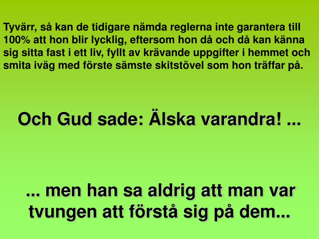 Tyvärr, så kan de tidigare nämda reglerna inte garantera till 100% att hon blir lycklig, eftersom hon då och då kan känna sig sitta fast i ett liv, fyllt av krävande uppgifter i hemmet och smita iväg med förste sämste skitstövel som hon träffar på. Och Gud sade: Älska varandra! ... ... men han sa aldrig att man var tvungen att förstå sig på dem...