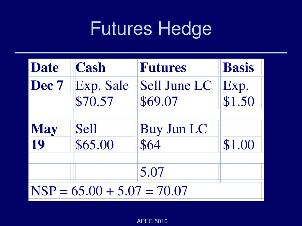 Closing (offsetting) a position • If buy/sell contract(s) they are offset by selling/buying a like number of contracts • Buy 10 April Live Cattle futures contracts on August 29, 2005 for $87.50/cwt. • Offset by selling 10 April Live Cattle futures contract sometime before the April contract matures (3rd week of April 2006) at whatever the price is on the day you sell APEC 5010