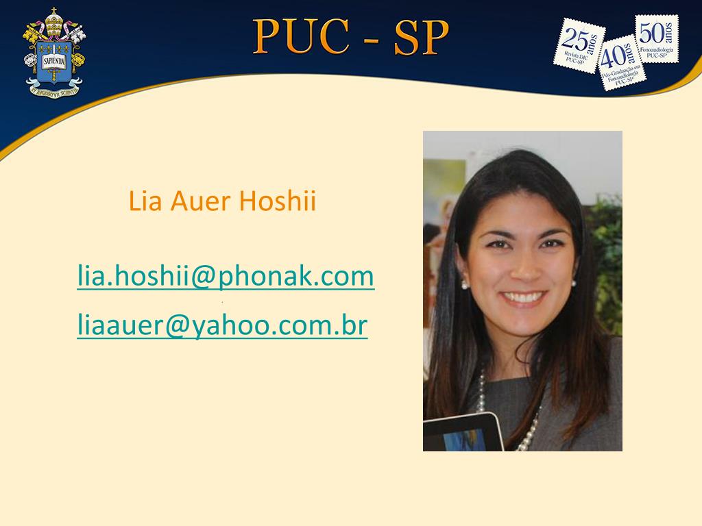 Lia Auer Hoshii 10 anos de formada na PUC-SP em Dez/2012 Graduação em Fonoaudiologia PUC-SP: 1999-2002 Especialista em Audiologia Santa Casa SP: 2003-2005 Mestrado em Fonoaudiologia PUC-SP:2008-2010