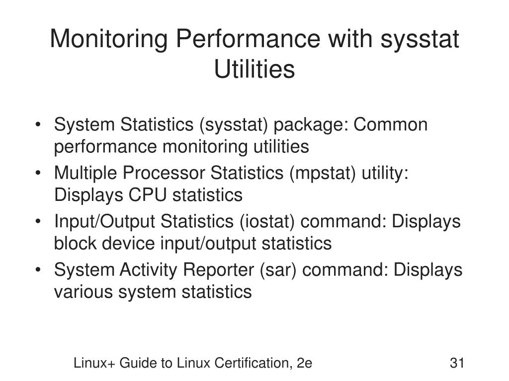 Monitoring Performance with sysstat Utilities • System Statistics (sysstat) package: Common performance monitoring utilities • Multiple Processor Statistics (mpstat) utility: Displays CPU statistics • Input/Output Statistics (iostat) command: Displays block device input/output statistics • System Activity Reporter (sar) command: Displays various system statistics Linux+ Guide to Linux Certification, 2e