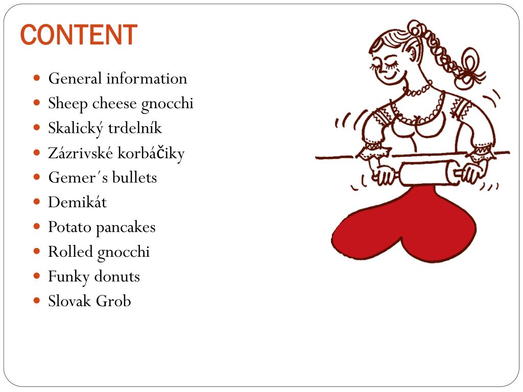 CONTENT • Generalinformation • Sheepcheesegnocchi • Skalický trdelník • Zázrivské korbáčiky • Gemer´sbullets • Demikát • Potatopancakes • Rolledgnocchi • Funkydonuts • Slovak Grob