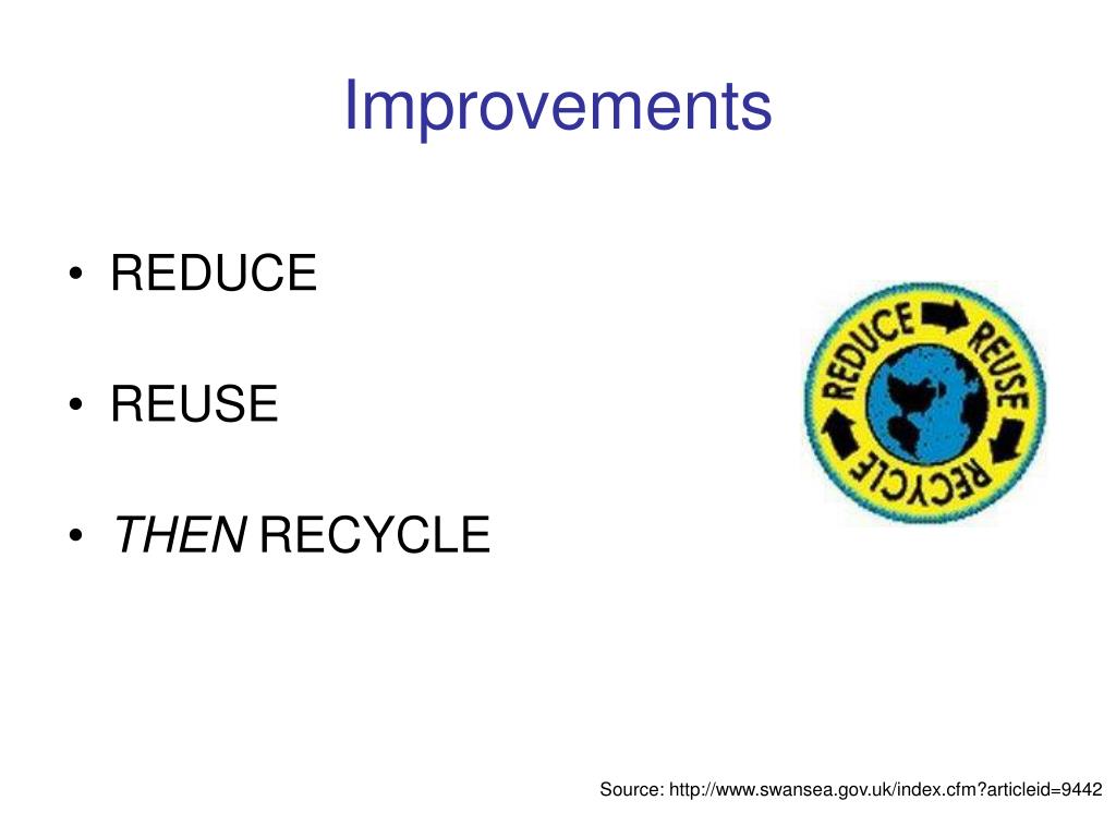 Improvements • REDUCE • REUSE • THEN RECYCLE Source: http://www.swansea.gov.uk/index.cfm?articleid=9442