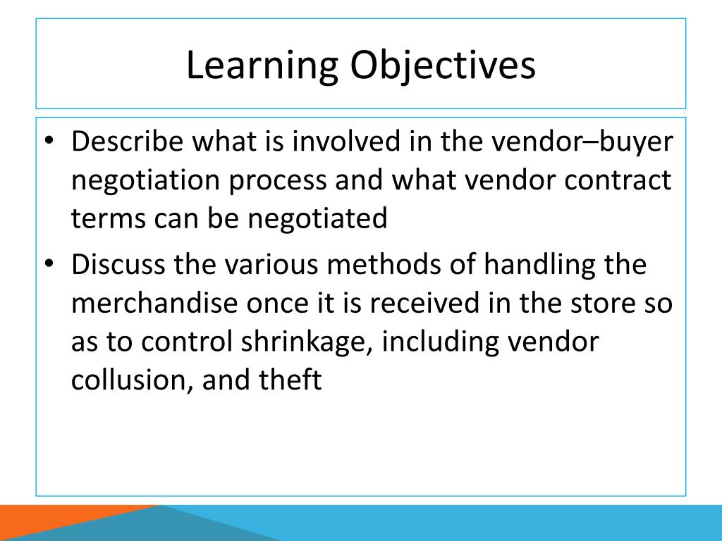 Learning Objectives Describe what is involved in the vendor–buyer negotiation process and what vendor contract terms can be negotiated Discuss the various methods of handling the merchandise once it is received in the store so as to control shrinkage, including vendor collusion, and theft