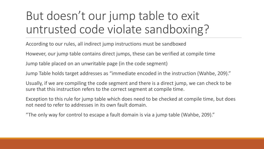 But doesn’t our jump table to exit untrusted code violate sandboxing? • According to our rules, all indirect jump instructions must be sandboxed • However, our jump table contains direct jumps, these can be verified at compile time • Jump table placed on an unwritable page (in the code segment) • Jump Table holds target addresses as “immediate encoded in the instruction (Wahbe, 209).” • Usually, if we are compiling the code segment and there is a direct jump, we can check to be sure that this instruction refers to the correct segment at compile time. • Exception to this rule for jump table which does need to be checked at compile time, but does not need to refer to addresses in its own fault domain. • “The only way for control to escape a fault domain is via a jump table (Wahbe, 209).”