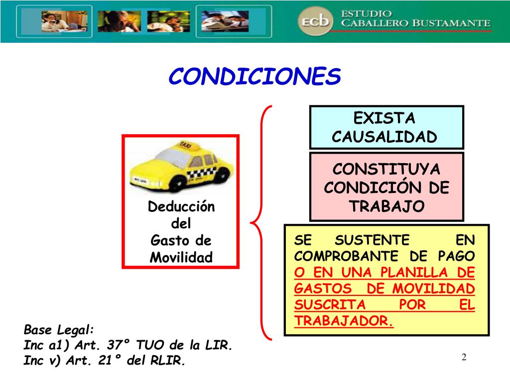 GASTOS DE MOVILIDAD. CONDICIONES. EXISTA CAUSALIDAD. CONSTITUYA CONDICIÓN DE TRABAJO. Deducción del Gasto de Movilidad . SE SUSTENTE EN COMPROBANTE DE PAGO O EN UNA PLANILLA DE GASTOS DE MOVILIDAD SUSCRITA POR EL TRABAJADOR. Base Legal: Inc a1) Art. 37° TUO de la LIR.