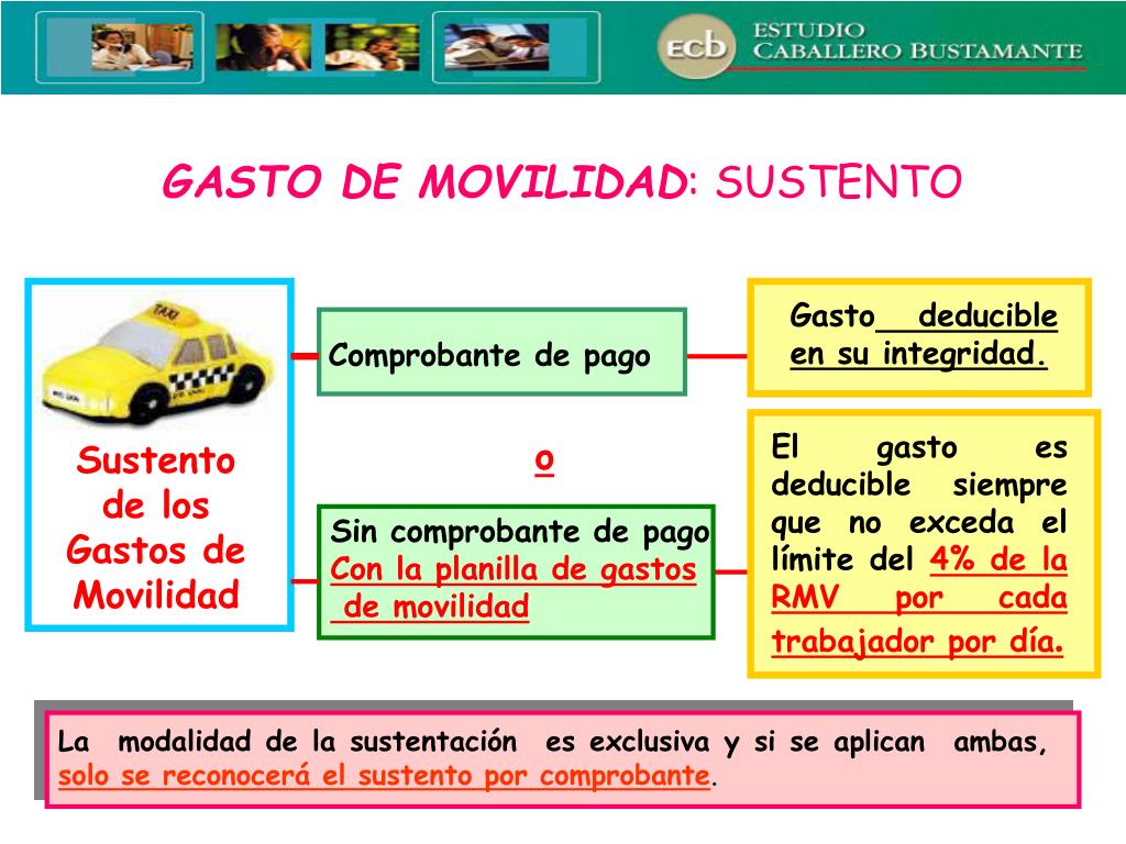 GASTO DE MOVILIDAD: SUSTENTO Gasto deducible en su integridad. Comprobante de pago El gasto es deducible siempre que no exceda el límite del 4% de la RMV por cada trabajador por día. o Sustento de los Gastos de Movilidad Sin comprobante de pago Con la planilla de gastos de movilidad La modalidad de la sustentación es exclusiva y si se aplican ambas, solo se reconocerá el sustento por comprobante.