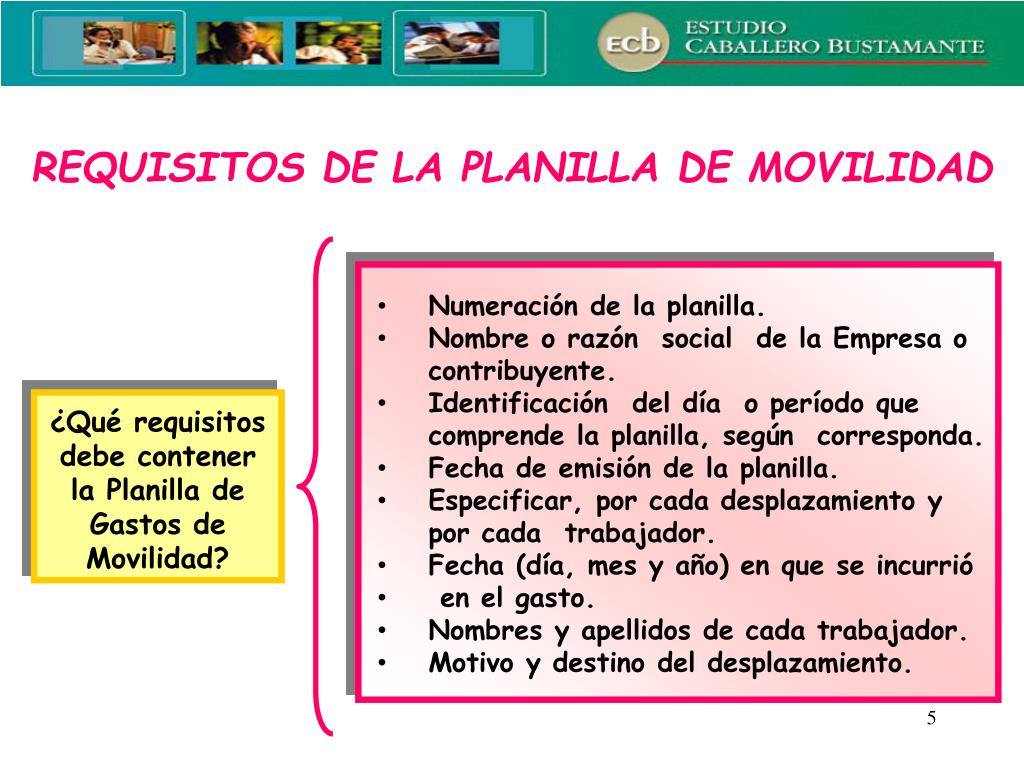 REQUISITOS DE LA PLANILLA DE MOVILIDAD • Numeración de la planilla. • Nombre o razón social de la Empresa o contribuyente. • Identificación del día o período que comprende la planilla, según corresponda. • Fecha de emisión de la planilla. • Especificar, por cada desplazamiento y por cada trabajador. • Fecha (día, mes y año) en que se incurrió • en el gasto. • Nombres y apellidos de cada trabajador. • Motivo y destino del desplazamiento. ¿Qué requisitos debe contener la Planilla de Gastos de Movilidad?