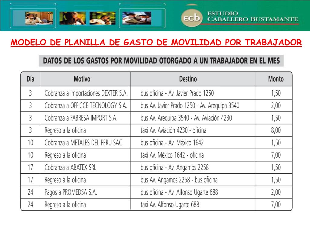 GASTOS DE MOVILIDAD POR TRABAJADOR Aplicación Práctica Las empresas INDUSTRIA DEL PERU S.A., identificada con N° de RUC 20122010112, nos consulta como deberá efectuar el sustento de los desembolsos por concepto de movilidad, que otorga a uno de sus trabajadores que labora, en el área de créditos y cobranzas. Cabe mencionar que la empresa solo tiene una persona que realiza gestiones de cobranza, entre otros. Datos adicionales: Nombre del Trabajador: Miguel Ardiles Moreno. Área: Créditos y cobranzas A continuación mostramos una relación de las gestiones efectuadas durante los días comprendidos entre el 1 y 31 de octubre de 2008.