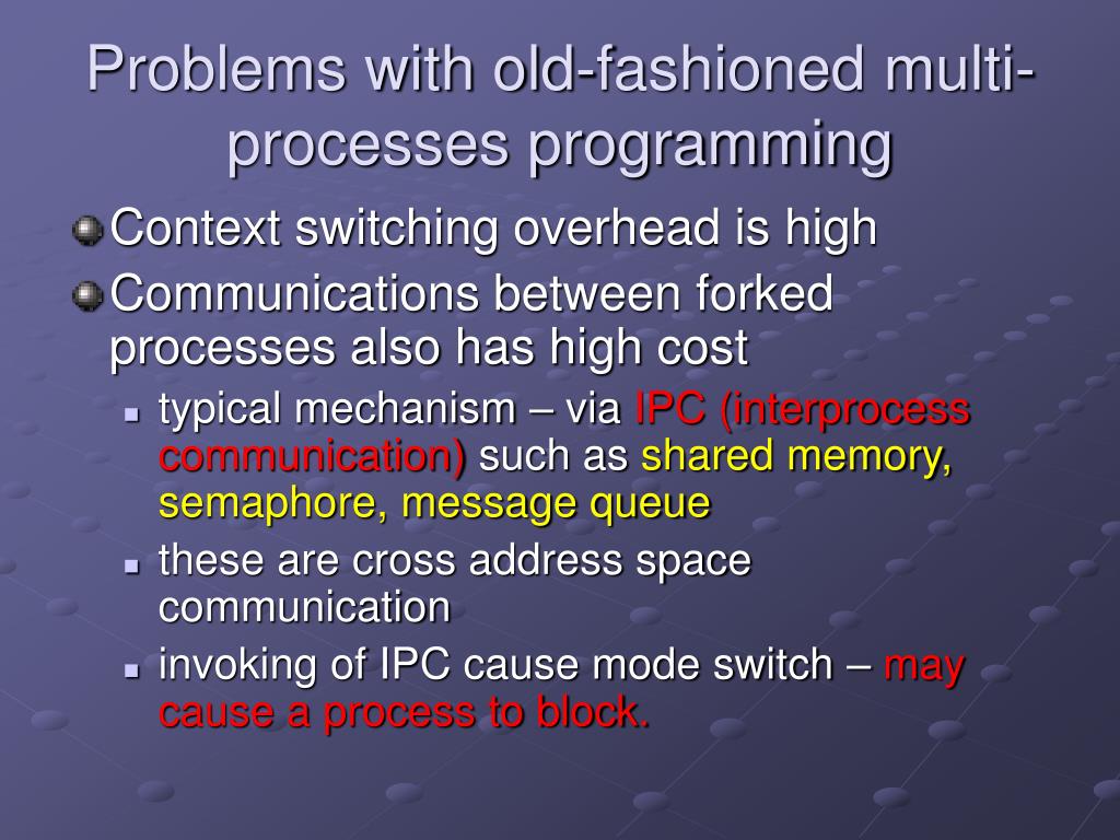 Problems with old-fashioned multi-processes programming • Context switching overhead is high • Communications between forked processes also has high cost • typical mechanism – via IPC (interprocess communication) such as shared memory, semaphore, message queue • these are cross address space communication • invoking of IPC cause mode switch – may cause a process to block.